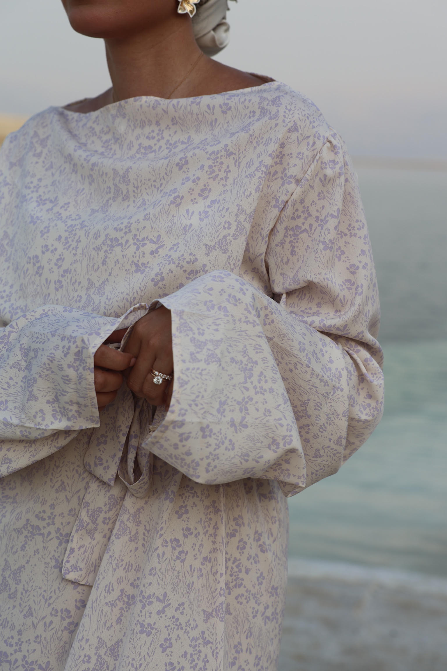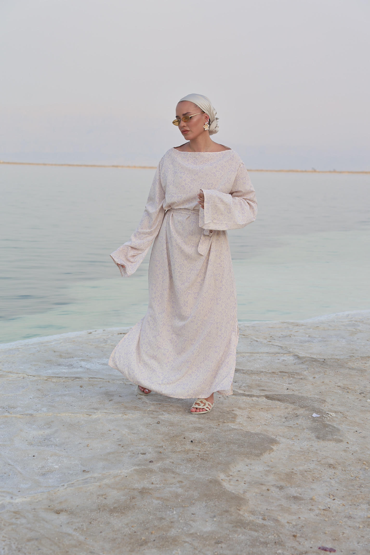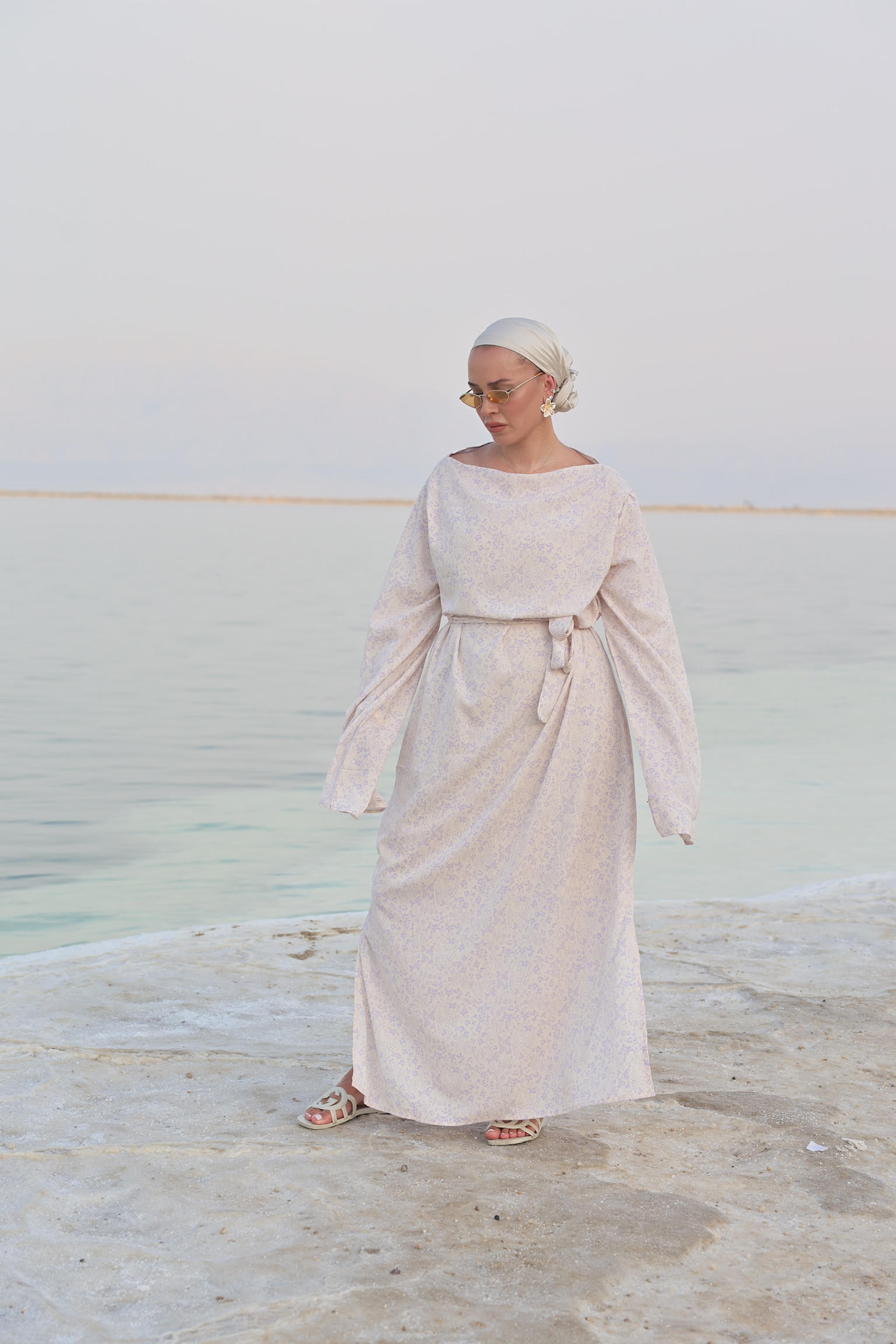 שמלה מבד קרפ נעימה ארוכה בגווני סגלגל עדינים עם שרוולים רחבים.