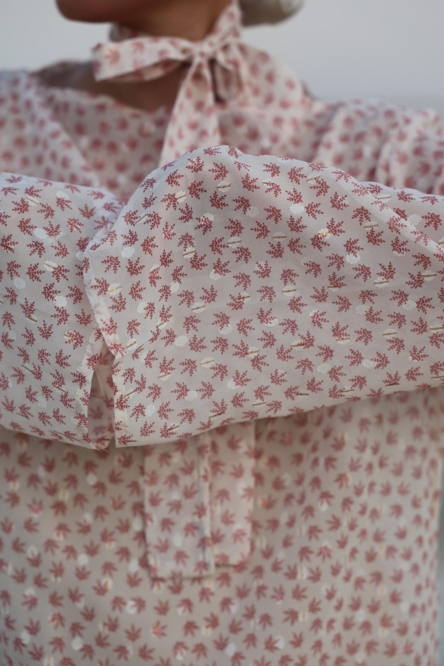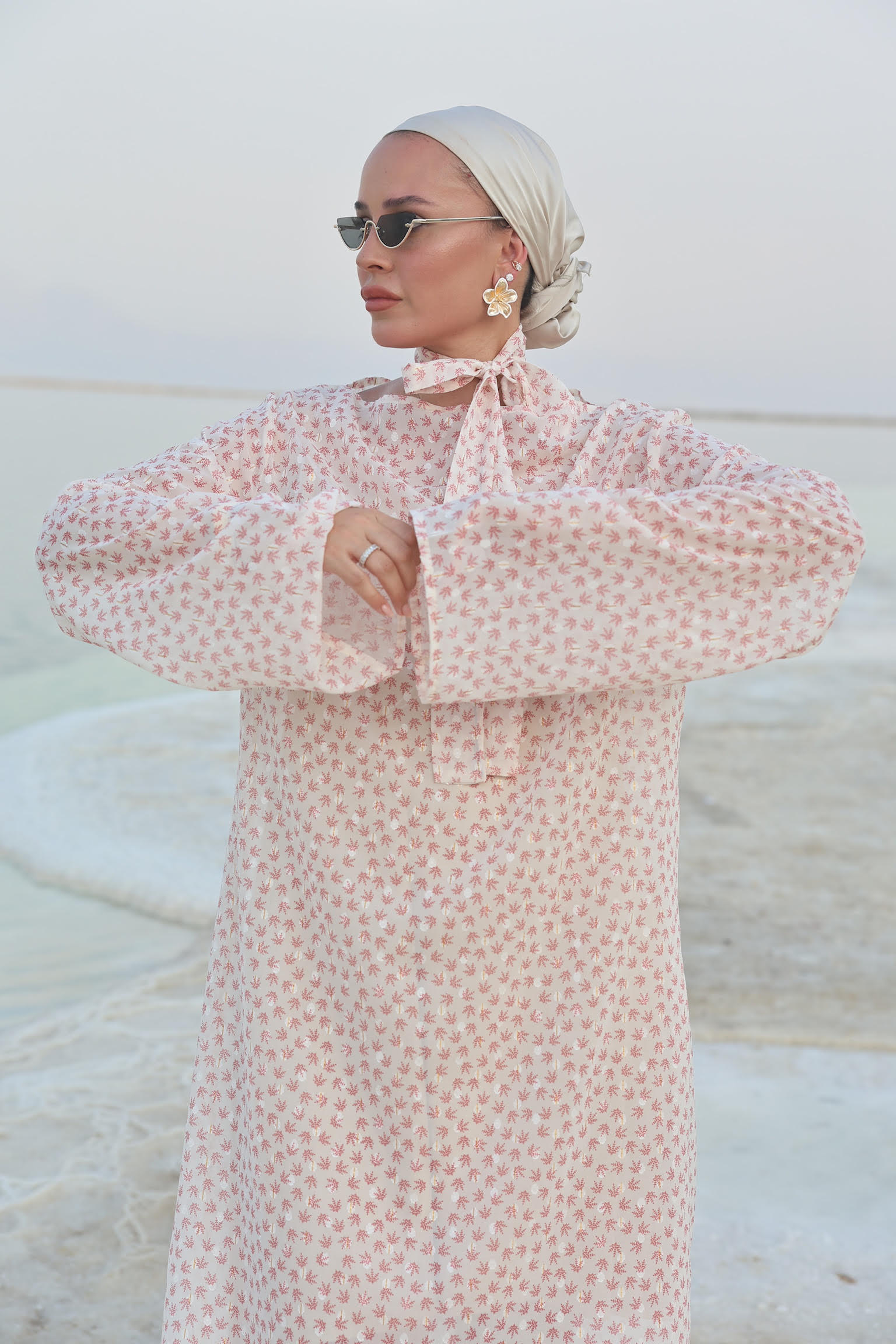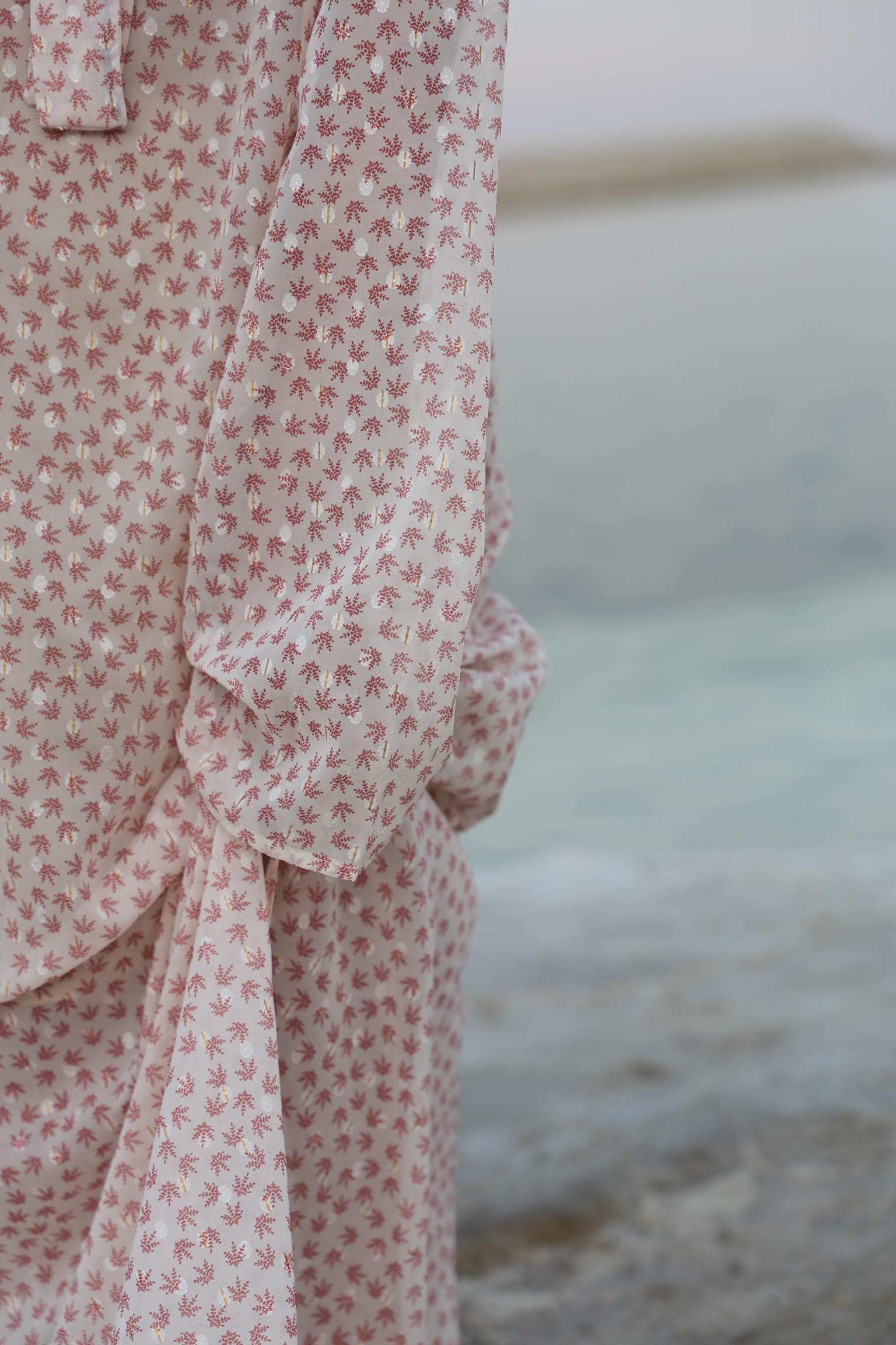 שמלה מבד שיפון נעימה ארוכה בגווני ורוד עדינים עם שרוולים רחבים.
