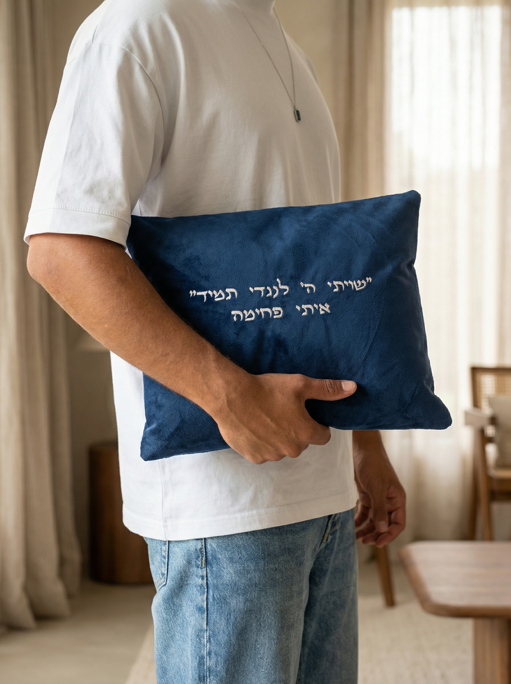 בתמונה- תיק טלית “שויתי ה לנגדי תמיד”  שם הלקוח , תפילין שם הלקוח